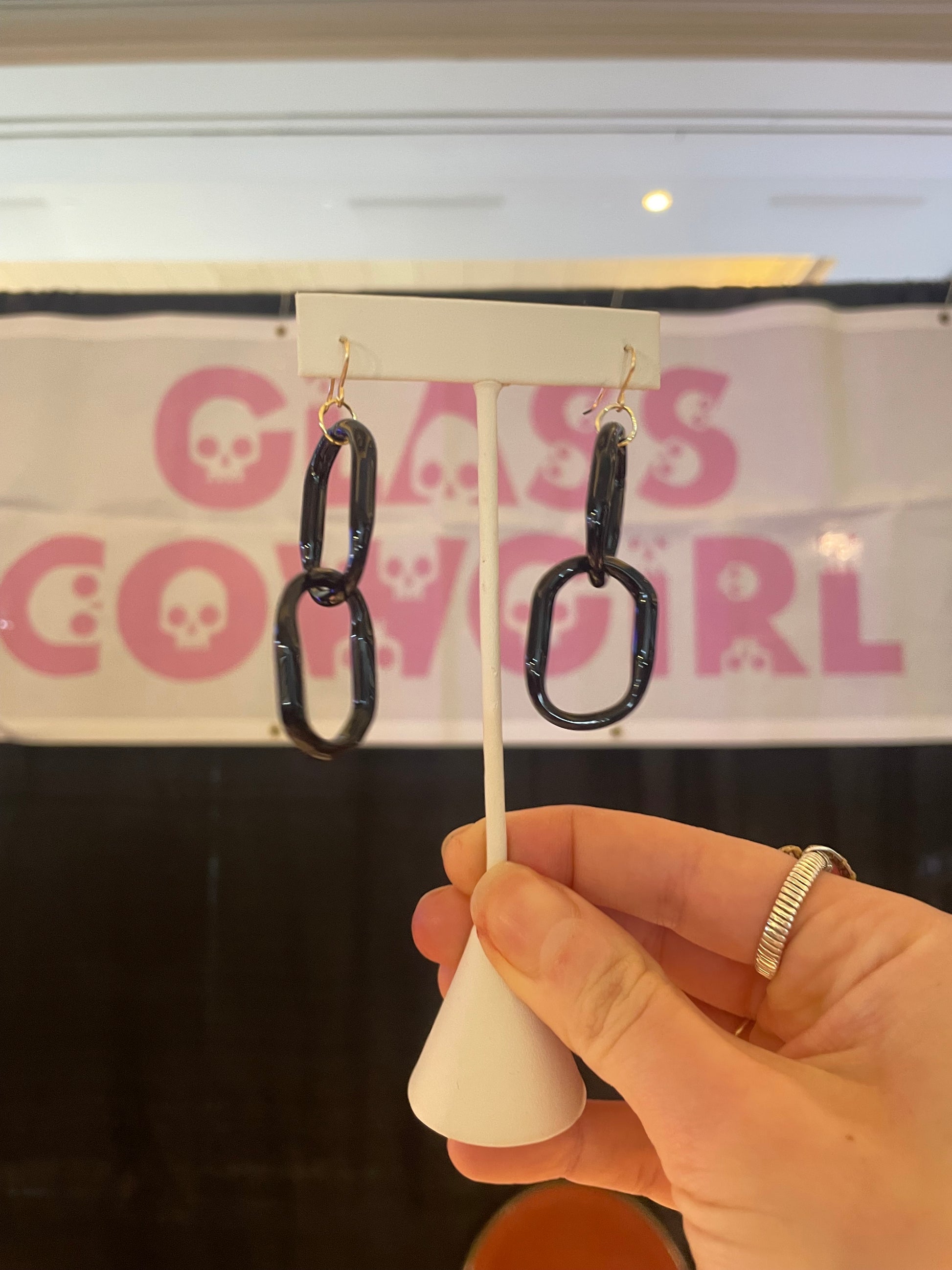 Hand-blown black knight glass chain earrings are made from borosilicate glass—also known as Pyrex. Each chain is individually hand-blown and shaped by Glass Cowgirl, ensuring that every piece is one-of-a-kind. Despite being glass, borosilicate (Pyrex) is remarkably lightweight, strong and ideal for everyday wear. Whether worn on its own or layered, this glass chain will complete any outfit.