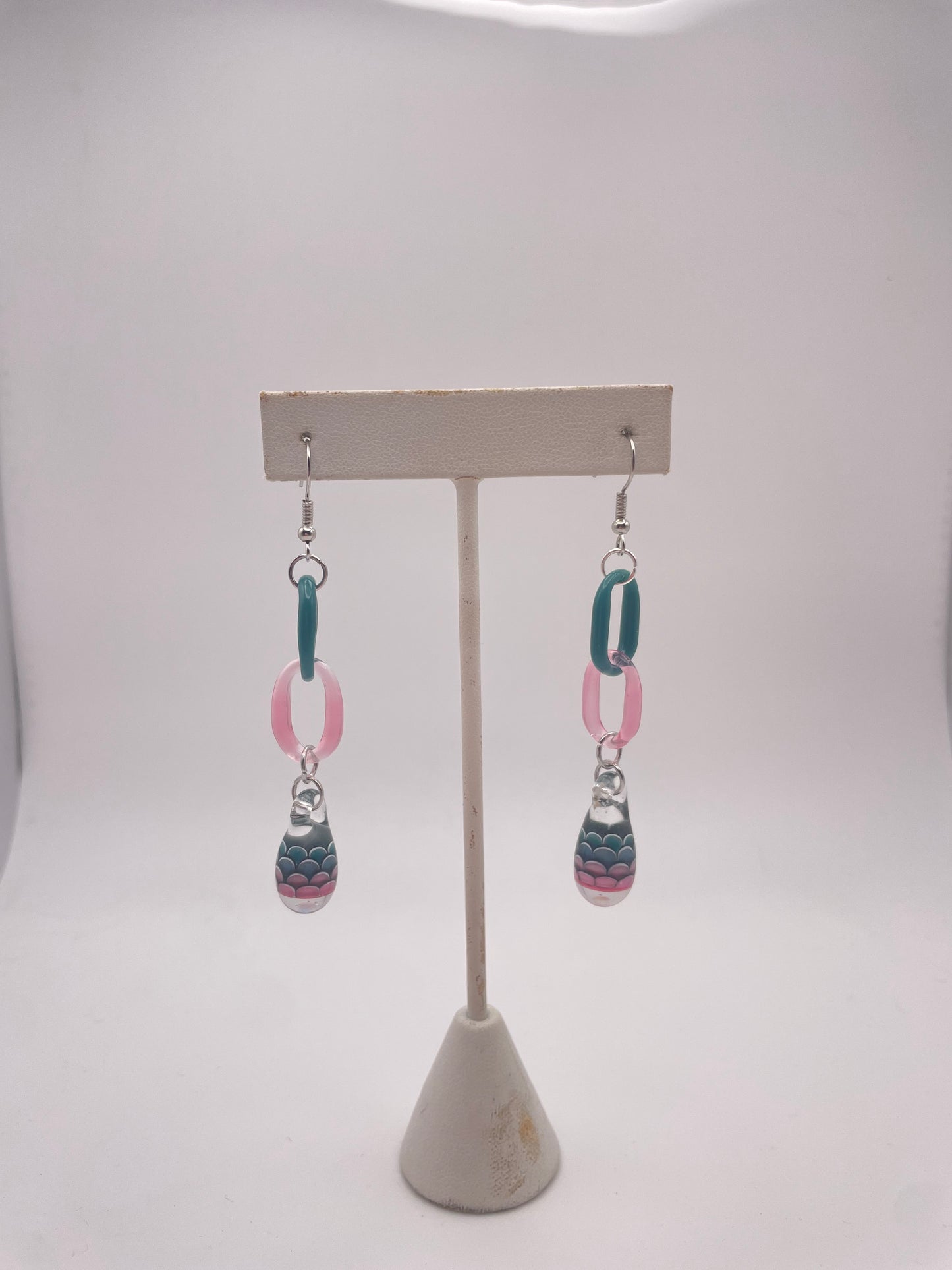 One of a kind aqua and magenta collab necklace and earring set with pendants by Juju Glass or Julia Straight, beads by Liquid Art Glass or Andrew Justin Barrows and chains by Glass Cowgirl. Both the earring and necklace pendants have opals encased in them to match. With sterling silver findings this necklace measures at 18” long.